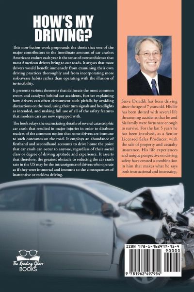 Synopsis: This non-fiction work propounds the thesis that one of the major contributors to the inordinate amount of car crashes Americans endure each year is the sense of overconfidence that most American drivers bring to our roads. It argues that most drivers would benefit immensely from examining their own driving practices thoroughly and from incorporating more risk-averse habits rather than operating with the illusion of invincibility. It presents various theorems that delineate the most common errors and catalysts behind car crashes, further explaining how drivers can often circumvent such pitfalls by avoiding distractions on the road, using their turn signals and headlights as intended, and making full use of all of the safety features that modern cars are now equipped with. The book relays the excruciating details of several catastrophic car crashes that resulted in major injuries in order to disabuse readers of the common notion that some drivers are immune to such outcomes on the road. It employs an abundance of firsthand and secondhand accounts to drive home the point that car accidents can occur to anyone, regardless of their social class or degree of driving aptitude and experience. It asserts that, therefore, the greatest obstacle to reducing the car crash rate in the US may be the intransigence of drivers who operate as if they were immortal and immune to the consequences of inattentive or reckless driving. Autobiography: Steve Dziadik has been driving automobiles since the age of 7 years old. His life has been dotted with several life-threatening accidents that he and his family were fortunate enough to survive. For the last 5 years he has been involved, as a Senior Licensed Sales Producer, with the sale of property and casualty insurance. His life experiences and unique perspective on driving safety have created a combination in him that makes what he says both instructional and interesting.