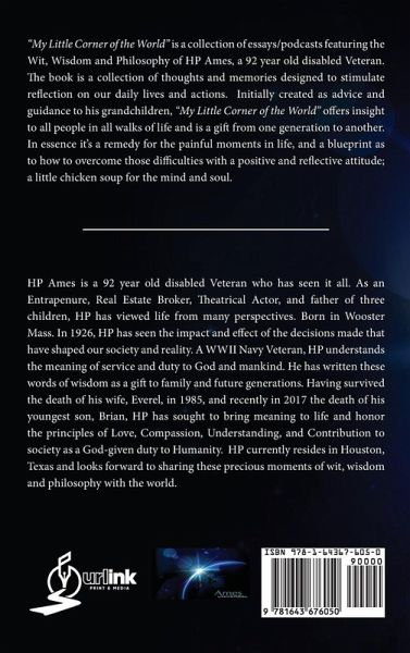 "My Little Corner of the World" is a collection of essays/podcast featuring the Wit, Wisdom and Philosophy of HP Ames, a 92 year old disabled Veteran. The book is a collection of thoughts and memories designed to stimulate reflection on our daily lives and actions. Initially created as advice and guidance to his grandchildren, "My Little Corner of the World" offers insight to all people in all walks of life and is a gift from one generation to another. In essence it’s remedy for the painful moments in life, and a blueprint as to how to overcome those difficulties with a positive and reflective attitude; a little chicken soup for the mind and soul.