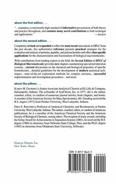 Completely revised to reflect the innovations in HPLC from the past decade, this authoritative reference presents practical strategies for the evaluation and analysis of proteins, peptides, and polynucleotides. Offering class-specific applications for the characterization and fractionation of biological macromolecules, the book contains material on organic supports, size exclusion, ion exchange, hydrophobic interaction, and metal interaction chromatography. Leading experts summarize specialized detection systems, provides discussions on the chemical and biological properties of specific biomolecules, include detailed guidelines for the development of analytical techniques, and more.