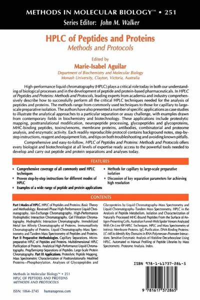 "...a showcase of state-of-the-art methodologies in the application of HPLC to protein/peptide studies...can be used by beginners and intermediate experts in this field to develop separation and analytical protocols...all scientists dealing with peptides and proteins can benefit from reading this book." - Proteomics