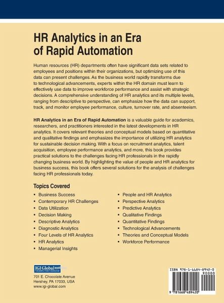 Human Resources (HR) departments often have significant data sets related to employees and positions within their organizations, but optimizing use of this data can present challenges. As the business world rapidly transforms due to technological advancements, experts within the HR domain must learn to effectively use data to improve workforce performance and assist with strategic decisions. A comprehensive understanding of HR analytics and its multiple levels, ranging from descriptive to perspective, can emphasize how the data can support, track, and monitor employee performance, culture, turnover rate, and absenteeism. HR Analytics in an Era of Rapid Automation is a valuable guide for academics, researchers, and practitioners interested in the latest developments in HR analytics. It covers relevant theories and conceptual models based on quantitative and qualitative findings and emphasizes the importance of utilizing HR analytics for sustainable decision making. With a focus on recruitment analytics, talent acquisition, employee performance analytics, and more, this book provides practical solutions to the challenges facing HR professionals in the rapidly changing business world. By highlighting the value of people and HR analytics for business success, this book offers several solutions for the analysis of challenges facing HR professionals today.