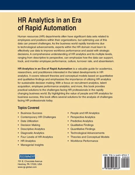 Human Resources (HR) departments often have significant data sets related to employees and positions within their organizations, but optimizing use of this data can present challenges. As the business world rapidly transforms due to technological advancements, experts within the HR domain must learn to effectively use data to improve workforce performance and assist with strategic decisions. A comprehensive understanding of HR analytics and its multiple levels, ranging from descriptive to perspective, can emphasize how the data can support, track, and monitor employee performance, culture, turnover rate, and absenteeism. HR Analytics in an Era of Rapid Automation is a valuable guide for academics, researchers, and practitioners interested in the latest developments in HR analytics. It covers relevant theories and conceptual models based on quantitative and qualitative findings and emphasizes the importance of utilizing HR analytics for sustainable decision making. With a focus on recruitment analytics, talent acquisition, employee performance analytics, and more, this book provides practical solutions to the challenges facing HR professionals in the rapidly changing business world. By highlighting the value of people and HR analytics for business success, this book offers several solutions for the analysis of challenges facing HR professionals today.
