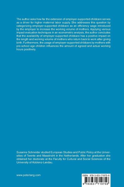 The author asks how far the extension of employer-supported childcare serves as a driver for higher maternal labor supply. She addresses this question by categorizing employer-supported childcare as an efficiency wage introduced by the employer to increase the working volume of mothers. Applying various impact evaluation techniques in an econometric analysis, the author concludes that the availability of employer-supported childcare has a positive impact on the length and working volume of mothers who return back to work after giving birth. Furthermore, the usage of employer-supported childcare by mothers with pre-school age children influences the amount of agreed and actual working hours positively.