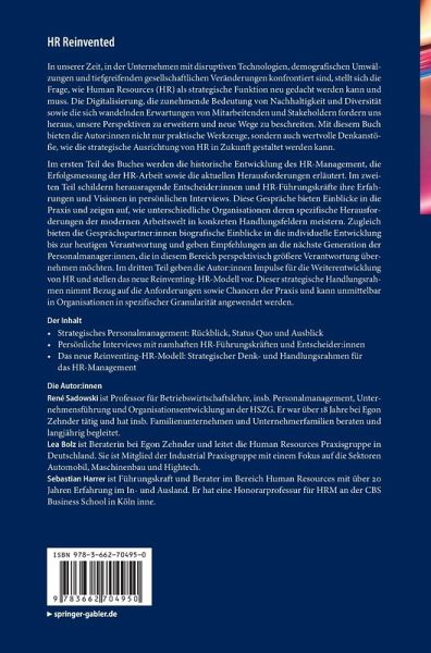 In unserer Zeit, in der Unternehmen mit disruptiven Technologien, demografischen Umwälzungen und tiefgreifenden gesellschaftlichen Veränderungen konfrontiert sind, stellt sich die Frage, wie Human Resources (HR) als strategische Funktion neu gedacht werden kann und muss. Die Digitalisierung, die zunehmende Bedeutung von Nachhaltigkeit und Diversität sowie die sich wandelnden Erwartungen von Mitarbeitenden und Stakeholdern fordern uns heraus, unsere Perspektiven zu erweitern und neue Wege zu beschreiten. Mit diesem Buch bieten die Autor:innen nicht nur praktische Werkzeuge, sondern auch wertvolle Denkanstöße, wie die strategische Ausrichtung von HR in Zukunft gestaltet werden kann. Im ersten Teil des Buches werden die historische Entwicklung des HR-Management, die Erfolgsmessung der HR-Arbeit sowie die aktuellen Herausforderungen erläutert. Im zweiten Teil schildern herausragende Entscheider:innen und HR-Führungskräfte ihre Erfahrungen und Visionen in sehr persönlichen Interviews. Diese Gespräche bieten Einblicke in die Praxis und zeigen auf, wie unterschiedliche Organisationen deren spezifische Herausforderungen der modernen Arbeitswelt in konkreten Handlungsfeldern meistern. Zugleich bieten die Gesprächspartner:innen biografische Einblicke in die individuelle Entwicklung bis zur heutigen Verantwortung und geben Empfehlungen an die nächste Generation der Personalmanager:innen, die in diesem Bereich perspektivisch größere Verantwortung übernehmen möchten. Im dritten Teil geben die Autor:innen Impulse für die Weiterentwicklung von HR und stellen das neue Reinventing-HR-Modell vor. Dieser strategische Handlungsrahmen nimmt Bezug auf die Anforderungen sowie Chancen der Praxis und kann unmittelbar in Organisationen in spezifischer Granularität angewendet werden.