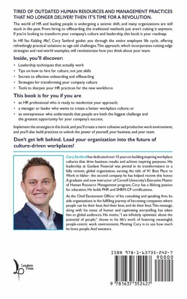 Is your organization or team stuck in a rut? Discover the cutting-edge yet practical approaches that are changing the Human Resources and leadership landscape. Traditional HR methods are failing to meet the evolving needs of companies and their employees. Cory Sanford's HR, You Kidding Me? offers a fresh perspective, providing humorous stories, actionable insights, and proven approaches for HR professionals, managers, and leaders who are ready for change. Unlock the secrets to:Learning the hottest leadership hacks for the new workforce Cultivating a workplace culture that thrives amid…mehr