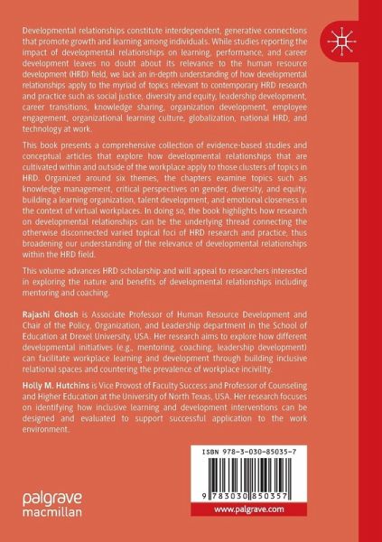 This volume advances HRD scholarship and will appeal to researchers interested in exploring the nature and benefits of developmental relationships including mentoring and coaching.