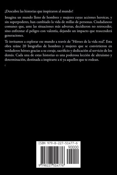 ¡Descubre las historias que inspiraron al mundo! Estimado lector, Imagina un mundo lleno de hombres y mujeres cuyas acciones heroicas, y sin superpoderes, han cambiado la vida de miles de personas. Ciudadanoss comunes que, ante las situaciones más adversas, decidieron no retroceder, sino enfrentar el peligro con valentía, dejando un impacto que trascenderá generaciones. Hoy, te invitamos a explorar ese mundo a través de nuestro libro: "Héroes de la vida real". Esta obra única reúne 20 biografías de hombres y mujeres que se convirtieron en verdaderos héroes gracias a su coraje, sacrificio y dedicación al servicio de los demás. Cada una de estas historias es una poderosa lección de altruismo y determinación, destinada a inspirarte a ti y a aquellos que te rodean. ¿Qué encontrarás en "Héroes de la vida real"? Historias de valor inquebrantable: Conoce a individuos que, en momentos cruciales, eligieron actuar, ya sea enfrentando la guerra, salvando vidas en situaciones de desastre o defendiendo los derechos humanos. Lecciones de sacrificio: Algunos dieron todo lo que tenían, incluso sus propias vidas, para garantizar la seguridad, la libertad y la dignidad de los demás. Un legado de inspiración: Desde figuras históricas hasta héroes contemporáneos, cada biografía está destinada a recordarnos que la valentía puede encontrarse en cualquier lugar, y que todos podemos ser capaces de marcar la diferencia. Entre los héroes que conocerás, se encuentran Malala Yousafzai, Nelson Mandela, Irena Sendler, Rick Rescorla, Harriet Tubman, Wangari Maathai, y muchos más. "Héroes de la vida real" no es solo un libro de historias inspiradoras, es una obra que te hará reflexionar sobre el poder del coraje humano y te alentará a ser parte del cambio que el mundo necesita. Cada página es un recordatorio de que las acciones valientes de personas comunes pueden cambiar el destino de la humanidad. Este libro es ideal para: Líderes y emprendedores que buscan motivación y ejemplos reales de liderazgo. Educadores y estudiantes que desean conocer a fondo el impacto de estos héroes en la historia y la sociedad. Cualquier persona que busque inspiración en su vida diaria y quiera encontrar modelos a seguir en tiempos difíciles. ¿Por qué necesitas este libro? En un mundo lleno de incertidumbres, es fácil perder la fe en la humanidad. Pero, con "Héroes de la vida real", te recordamos que las personas con integridad, valentía y sacrificio aún existen y que sus acciones tienen un eco que resuena en nuestras vidas hoy. Estas historias no solo son relatos de personas extraordinarias; son testimonios de cómo cada uno de nosotros tiene la capacidad de enfrentar los desafíos con coraje y cambiar el mundo. No dejes que estas historias de coraje pasen desapercibidas.Transforma tu perspectiva, inspira a otros y honra el legado de quienes han dado todo por un mundo mejor.