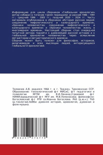 Informaciü dlq cikla sbornikow «Global'naq hronologiq» awtor sobiral w techenie tremq periodami: a) rannij 1986 - 1991 gg.; srednij 1996 - 2003 gg.; pozdnij 2020 ¿ 2024 gg. Chast' materiala opublikowana w sbornikah «Istoriq russkih lüdej: soedinenie mifologicheskogo i kalendarnogo wremeni», «Hroniki chelowechestwa: soedinenie mifologicheskogo i kalendarnogo wremeni» i «Hroniki chelowechestwa: zhizn' w mnogomernom wremeni». Nastoqschij sbornik stal ocherednoj popytkoj awtora podojti k drewnejshej russkoj istorii i k global'noj hronologii chelowechestwa cherez osmyslenie metaistorii i metaistoricheskogo wremeni.Sbornik mozhet byt' polezen dlq filosofow, istorikow, religiowedow i wseh myslqschih lüdej, interesuüschihsq global'nogj hronologiej.