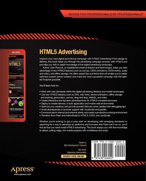 Takes you through the advertising campaign process with HTML5 from design to delivery Provides in-depth knowledge into the digital advertising landscape and the HTML5 specification Communicates tips and tricks coming from Flash and ActionScript to HTML5, CSS3 and JavaScript. HTML5 Advertising equips you with the knowledge to attack cutting-edge, rich media projects with confidence and scale, while also learning the essentials to communicate to internal and external clients. HTML5 is here whether you like it or not, so why not jump in early and head down the path of building the future.