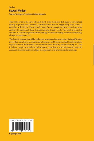 This book reviews the three life-and-death crisis moments that Huawei experienced during its growth and the major transformation process triggered by these crises. It describes in detail how Huawei thinks about future strategies at these critical moments and how to implement these strategies during its daily work. This book involves the content of corporate globalization strategy decision making, overseas marketing, change management, etc.