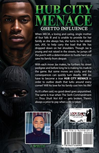 When Mecia, a loving and caring, single mother of four falls ill and is unable to provide for her family as she always has, she turns to her eldest son, Jax, to help carry the load that life has dropped down on her shoulders. Though Jax is young and not raised in the streets, he jumps off the porch with a determination to hustle hard and save his family from despair. With each move Jax makes, he furthers his street pedigree and before long he is making his mark in the game. But some moves are costly, and the consequences can quickly turn deadly. Will Jax have to become a true HUB CITY MENACE in order to outlive death that lurks around every corner? Will his love for his family cost him his life? As it's often said, no good deed goes unpunished. The same is true when The Sixth Commandment - Thou Shalt Not Kill - gets broken. There's always a price to pay when a life is taken.