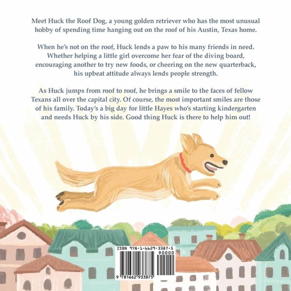 Meet Huck the Roof Dog, a young golden retriever who has the most unusual hobby of spending time hanging out on the roof of his Austin, Texas home. When he's not on the roof, Huck lends a paw to his many friends in need. Whether helping a little girl overcome her fear of the diving board, encouraging another to try new foods, or cheering on the new quarterback, his upbeat attitude always lends people strength. As Huck jumps from roof to roof, he brings a smile to the faces of fellow Texans all over the capital city. Of course, the most important smiles are those of his family. Today's a big day for little Hayes who's starting kindergarten and needs Huck by his side. Good thing Huck is there to help him out!
