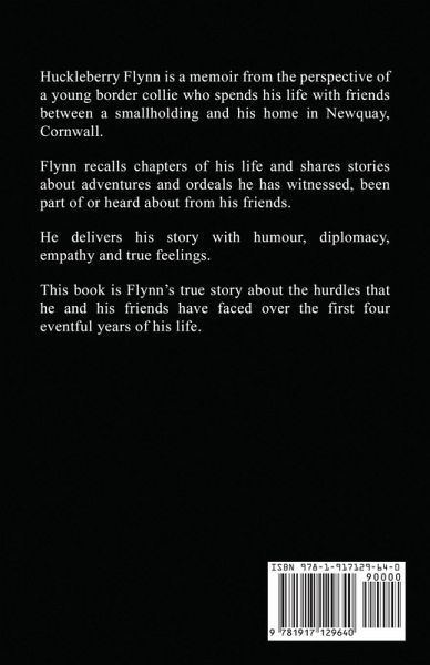 Huckleberry Flynn is a memoir from the perspective of a young border collie who spends his life with friends between a smallholding and his home in Newquay, Cornwall. Flynn recalls chapters of his life and shares stories about adventures and ordeals he has witnessed, been part of or heard about from his friends. He delivers his story with humour, diplomacy, empathy and true feelings. This book is Flynn's true story about the hurdles that he and his friends have faced over the first four eventful years of his life.