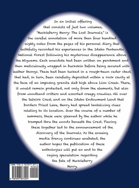 This anthology of over four hundred eighty anecdotes in two volumes is an accurate annotation of entries that were taken from the pages of Huckleberry Henry's personal journal. It was found meticulously wrapped in buckskin and securely tied with leather thongs, tucked inside a rough hewn cedar chest, that had, in turn, been carefully deposited by Henry in a small cavity in the rock beneath a wide granite overhang high above Lion Creek. There, Henry had made certain that it would remain protected from the elements as well as from woodland creatures and creepy crawlies. Subsequently, he left tantalizing hints relating to the whereabouts of the journal. It was these clues, gleaned by the author during many summers tramping in the woods along the Selkirk Crest, that led him to its discovery. It seems clear that the journal had been preserved by the Hand of the Almighty to give those of us who believe in the Strange Tale of Huckleberry Henry further insight into his every-day activities. The circumstances of his life in the woods above Priest Lake, Idaho, were unique; nevertheless, each of us can learn valuable lessons from his experiences that can be applied to our own benefit.