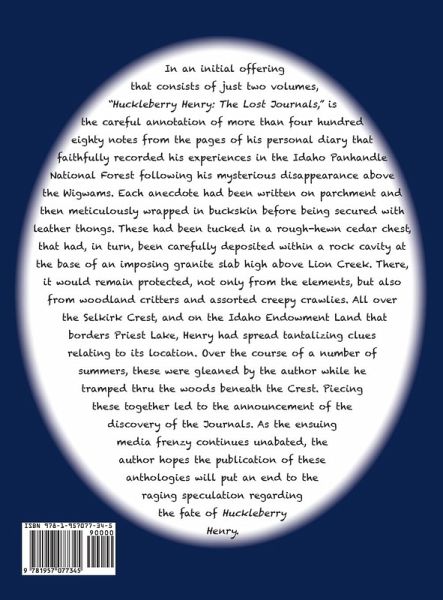This anthology of over four hundred eighty anecdotes in two volumes is an accurate annotation of entries that were taken from the pages of Huckleberry Henry's personal journal. It was found meticulously wrapped in buckskin and securely tied with leather thongs, tucked inside a rough hewn cedar chest, that had, in turn, been carefully deposited by Henry in a small cavity in the rock beneath a wide granite overhang high above Lion Creek. There, Henry had made certain that it would remain protected from the elements as well as from woodland creatures and creepy crawlies. Subsequently, he left tantalizing hints relating to the whereabouts of the journal. It was these clues, gleaned by the author during many summers tramping in the woods along the Selkirk Crest, that led him to its discovery. It seems clear that the journal had been preserved by the Hand of the Almighty to give those of us who believe in the Strange Tale of Huckleberry Henry further insight into his every-day activities. The circumstances of his life in the woods above Priest Lake, Idaho, were unique; nevertheless, each of us can learn valuable lessons from his experiences that can be applied to our own benefit.
