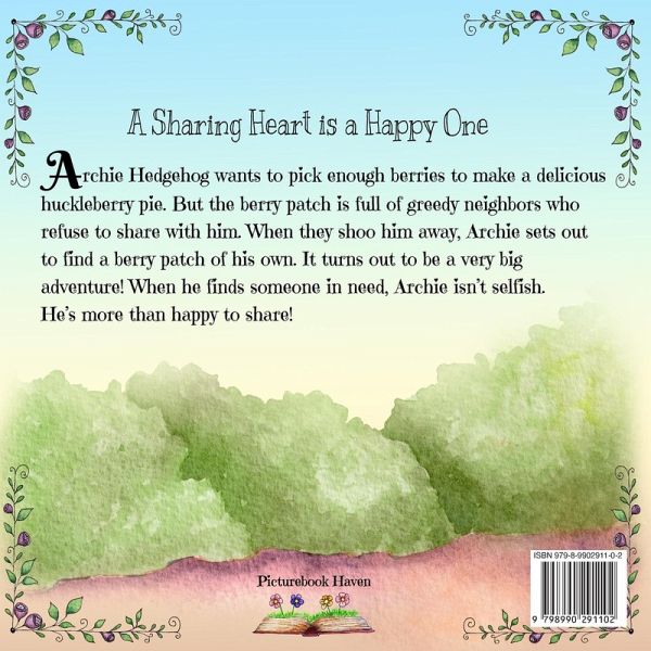 A sharing heart is a happy one. Archie Hedgehog wants to pick enough berries to make a delicious huckleberry pie. But the berry patch is full of greedy neighbors who refuse to share with him. When they shoo him away, Archie sets out to find a berry patch of his own. It turns out to be a very big adventure! When he finds someone in need, Archie isn't selfish. He's more than happy to share!