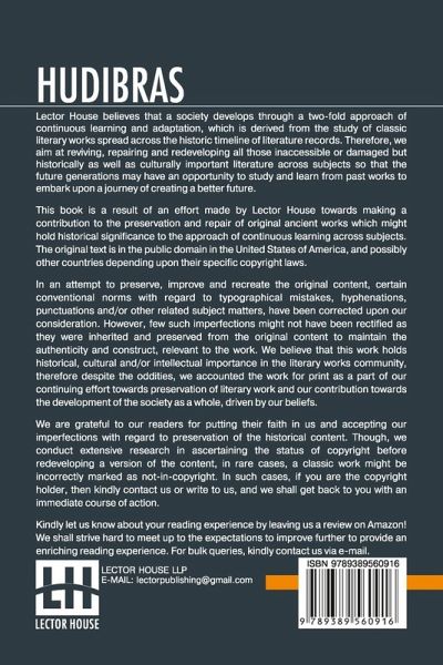 Hudibras: Written In The Time Of The Late Wars With Annotations This book is a result of an effort made by us towards making a contribution to the preservation and repair of original classic literature. In an attempt to preserve, improve and recreate the original content, we have worked towards: 1. Type-setting & Reformatting: The complete work has been re-designed via professional layout, formatting and type-setting tools to re-create the same edition with rich typography, graphics, high quality images, and table elements, giving our readers the feel of holding a 'fresh and newly' reprinted and/or revised edition, as opposed to other scanned & printed (Optical Character Recognition - OCR) reproductions. 2. Correction of imperfections: As the work was re-created from the scratch, therefore, it was vetted to rectify certain conventional norms with regard to typographical mistakes, hyphenations, punctuations, blurred images, missing content/pages, and/or other related subject matters, upon our consideration. Every attempt was made to rectify the imperfections related to omitted constructs in the original edition via other references. However, a few of such imperfections which could not be rectified due to intentional\unintentional omission of content in the original edition, were inherited and preserved from the original work to maintain the authenticity and construct, relevant to the work. We believe that this work holds historical, cultural and/or intellectual importance in the literary works community, therefore despite the oddities, we accounted the work for print as a part of our continuing effort towards preservation of literary work and our contribution towards the development of the society as a whole, driven by our beliefs. We are grateful to our readers for putting their faith in us and accepting our imperfections with regard to preservation of the historical content. HAPPY READING!
