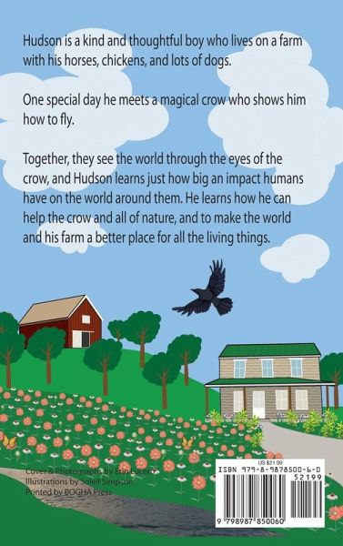 Hudson is a kind and thoughtful little boy who lives on a farm with his horse, goats, chickens, and lots of dogs. One special day he meets a magical crow who shows him how to fly. Together, they see the world through the eyes of the crow and learn just how big an impact humans have on the world around them. Hudson learns how he can help the crow and all the plants and animals in nature, and make it a happier place for all the living things.