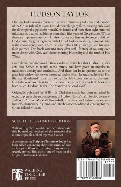 Hudson Taylor was as a nineteenth century missionary to China and founder of the China Inland Mission. He did these things by faith, trusting only God for all temporal supplies for himself, his family, and more than eight hundred missionaries that joined him in more than fifty years of Gospel labor. While these are impressive numbers, Hudson Taylor was first and foremost a child of God, constantly growing in his faith. One of Taylor's greatest gifts to posterity is the transparency with which he wrote about life challenges and his own faith journey. This book contains story after real-life story of walking ever more closely with God, each demonstrating His reality and the truth of His Word. From the author's foreword, "There can be no doubt but that Hudson Taylor's acts have helped to mould men's minds, and have given an impulse to missionary activity and methods.... And there can be no question as to the great idea with which he was possessed, and to which he attached himself. His life was dominated from first to last by his conviction as to the utter faithfulness of God. It is for this reason that the title of this little book has been called: Hudson Taylor: The Man who believed God." Originally published in 1929, this Christian classic has been refreshed in order to present the encouragement of Hudson Taylor's faith in God to a new audience. Author Marshall Broomhall, a nephew to Hudson Taylor, was himself a missionary in China, and later became the editorial secretary for the China Inland Mission. About the Scripture Testimony Edition Walking Together Press has enhanced this classic title by identifying and marking portions of the narrative that illustrate specific Biblical topics and verses. An extensive Scripture Testimony Index has also been added containing short summaries of how each topic is illustrated, making locating specific stories easy. Furthermore, this title is one of many in the Scripture Testimony Collection.