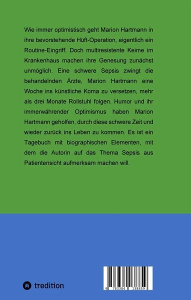 Marion Hartmann begibt sich zuversichtlich ins Krankenhaus, um sich einer notwendigen Hüft-Operation zu unterziehen, eigentlich ein Routine-Eingriff. Sie hat sich nach einer schweren Sepsis und einer Woche im künstlichen Koma ins Leben zurückgekämpft. Sie verbrachte zwei Monate im Krankenhaus, einige Tage im Pflegeheim. Mit Hilfe ihrer Familie und ihres Freundeskreises, einem unbändigen Lebenswillen und eiserner Disziplin verbringt sie drei Monate im Rollstuhl in ihrer Wohnung ohne zu verzweifeln, um dann nach fünf Monaten die künstliche Hüfte eingesetzt zu bekommen. Auch mit einer Prise Humor beschreibt sie diese Zeit.…mehr