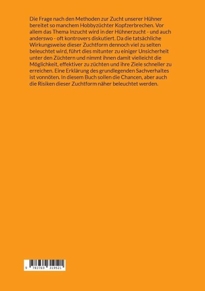 Die Frage nach den Methoden zur Zucht unserer Hühner bereitet so manchem Hobbyzüchter Kopfzerbrechen. Vor allem das Thema Inzucht wird in der Hühnerzucht - und auch anderswo - oft kontrovers diskutiert. Da die tatsächliche Wirkungsweise dieser Zuchtform dennoch viel zu selten beleuchtet wird, führt dies mitunter zu einiger Unsicherheit unter den Züchtern und nimmt ihnen damit vielleicht die Möglichkeit, effektiver zu züchten und ihre Ziele schneller zu erreichen. Eine Erklärung des grundlegenden Sachverhaltes ist vonnöten. In diesem Buch sollen die Chancen, aber auch die Risiken dieser Zuchtform näher beleuchtet werden.