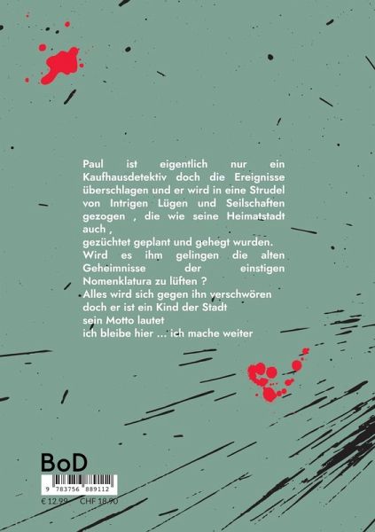 Paul ist eigentlich nur ein Kaufhausdetektiv doch die Ereignisse überschlagen und er wird in eine Strudel von Intrigen Lügen und Seilschaften gezogen , die wie seine Heimatstadt auch , gezüchtet geplant und gehegt wurden.Wird es ihm gelingen die alten Geheimnisse der einstigen Nomenklatura zu lüften ?Alles wird sich gegen ihn verschwören doch er ist ein Kind der Stadt sein Motto lautet ich bleibe hier ... ich mache weiter