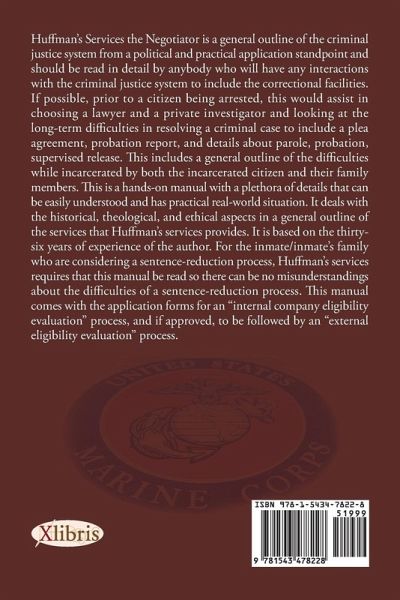 Huffmans Services the Negotiator is a general outline of the criminal justice system from a political and practical application standpoint and should be read in detail by anybody who will have any interactions with the criminal justice system to include the correctional facilities. If possible, prior to a citizen being arrested, this would assist in choosing a lawyer and a private investigator and looking at the long-term difficulties in resolving a criminal case to include a plea agreement, probation report, and details about parole, probation, supervised release. This includes a general outline of the difficulties while incarcerated by both the incarcerated citizen and their family members. This is a hands-on manual with a plethora of details that can be easily understood and has practical real-world situation. It deals with the historical, theological, and ethical aspects in a general outline of the services that Huffmans services provides. It is based on the thirty-six years of experience of the author. For the inmate/inmates family who are considering a sentence-reduction process, Huffmans services requires that this manual be read so there can be no misunderstandings about the difficulties of a sentence-reduction process. This manual comes with the application forms for an internal company eligibility evaluation process, and if approved, to be followed by an external eligibility evaluation process.