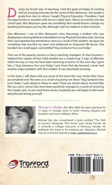 During my fourth year of teaching, I had the great privilege of working with an amazing educator by the name of Miss Bezanson. She taught a grade four class to whom I taught Physical Education. Therefore, I had the opportunity to socialize with her on a daily basis. About six months into the school year, Miss Bezanson gave me something that would forever change my teaching techniques and my life, although I did not realize it at that moment. One afternoon, I was in Miss Bezanson's class discussing a student who was displaying increasing behavioural problems in my Physical Education class. Sensing that I was experiencing tremendous stress as a result of this student, she gave me something that touched my heart and reinforced an important life lesson. She handed me a small paper card entitled "Hug Someone You Love Today". That was it! No preachy sermon or fancy teaching strategies. At that moment, I realized that maybe all that child needed was a simple hug. A sign of affection which he may or may not have been receiving at home. So the next day, I gave him a "Hug Someone You Love Today" card. From that day forward, I never had another major problem with that student. It was absolutely amazing. In this book, I will share with you some of the heart-felt, true stories that I have accumulated over the years as a result of passing out these "Hug Someone You Love Today" cards along to those in need. These are stories about normal folks like you and I, whose lives have been positively changed as a result of receiving this simple card. As you read these stories, hopefully you will begin to feel more peaceful and loving yourself.