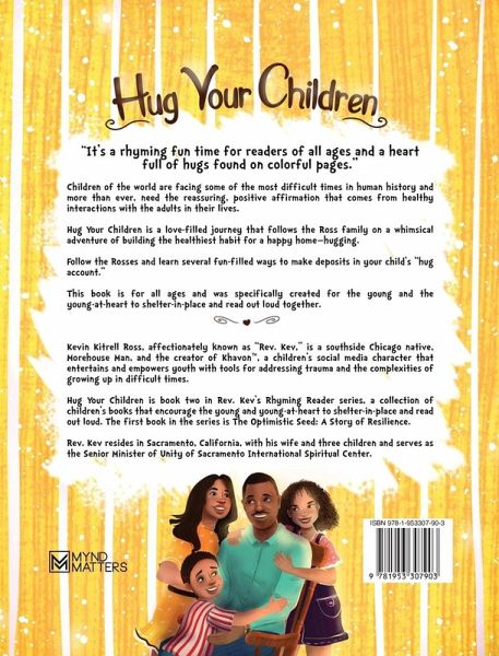 Enjoy the rhymes, the fun times, and the hugs! Children of the world are facing some of the most difficult times in human history and more than ever, need the reassuring, positive affirmation that comes from healthy interactions with the adults in their lives. Hug Your Children is a love-filled journey that follows the Ross family on a whimsical adventure of building the healthiest habit for a happy home-hugging. Follow the Rosses and learn several fun-filled ways to make deposits in your child's "hug account." This book is for all ages and was specifically created for the young and the young-at-heart to shelter-in-place and read out loud together.