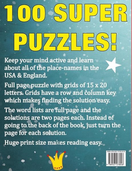 HUGE PRINT USA & ENGLAND WORD SEARCH PUZZLES AND SOLUTIONS All US States and English Counties are featured. 24 place names are hidden in each puzzle. No eye strain with this book! This book is a great way to relax while keeping your mind active. The huge print size makes the puzzles, word lists and solutions easy to read. You could learn something new about the choices of place names in each state and county. The puzzles are of medium complexity. You will spend hours of brain challenging activity finding each place name. Bonus tip - check off each place that you have ever visited or if you know someone from that location. Huge print easy-to-read puzzles Giant full-page puzzles Four pages per puzzle Full-page word list 24 Font Size Full page grid 2 full-page solutions 24 place name words to find in each puzzle
