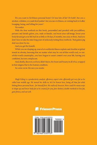 Do you want to hit fitness personal bests? Or lose lots of fat? Or both? Are you a smoker, a drinker, or a junk food junkie? Are you new to fitness, or coming back to it after lounging, lazing, and lolling for years? No matter. With the four methods in this book, personified and proofed with peccadilloes, pictures and details galore, you, male or female, can boost your self image, lower your body fat and get your life back in as little as 50 days, 6 months, one year, or three. And you don't have to take the nine long years of arduously testing these methods. That guinea pig deal was done by me. And you get the benefit. While you are shaping up, marvel at worldwide fitness exploits and shudder at global trends in obesity, knowing that no matter what may be out-of-this-world-cool, or out-of-this-world-catastrophic, you have begun to assert control over your life, leaving you confident, but not complacent. And, finally, discover, as if you didn't know, the beast and beauty in all of us, wrapped in that enigma that is the human condition. So come on in: the new you awaits.