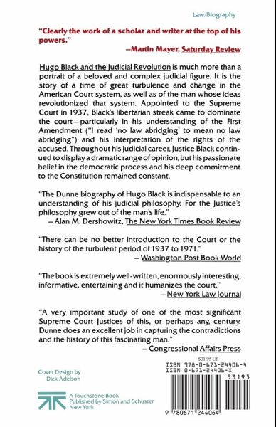 From Simon & Schuster, Hugo Black and the Judicial Revolution is "one of the prime judicial biographies of our time." (Max Lerner) A native of St. Louis, Professor Dunne is a graduate of Georgetown University and St. Louis University Law School. He is the author of Monetary Decisions of the Supreme Court and Justice Joseph Story and The Rise of the Supreme Court.
