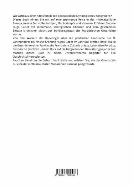 Wie wird aus einer Adelsfamilie die bedeutendste Dynastie eines Königreichs?Dieses Buch nimmt Sie mit auf eine spannende Reise in das mittelalterliche Europa, in eine Zeit voller Intrigen, Machtkämpfe und Visionen. Erfahren Sie, wie Hugo Capet mit Diplomatie, strategischen Allianzen und dem geschickten Einsatz kirchlicher Macht zur Schlüsselgestalt der französischen Geschichte wurde.Von den Wurzeln der Kapetinger über die politischen Umbrüche des 9. Jahrhunderts bis hin zur Krönung Hugos Capet im Jahr 987 erzählt Emile Braille die Geschichte einer Familie, die Frankreichs Zukunft prägte. Lebendige Porträts, historische Einblicke und ein Blick auf die tiefgreifenden Umwälzungen jener Zeit machen dieses Buch zu einem unverzichtbaren Begleiter für alle Geschichtsinteressierten.Tauchen Sie ein in die Geburt Frankreichs und erleben Sie, wie der Grundstein für eine der einflussreichsten Monarchien Europas gelegt wurde.