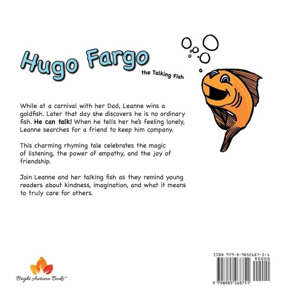 At the carnival, Leanne wins a special prize, a shiny goldfish she names Hugo Fargo. Leanne soon discovers something magical, only she can hear Hugo Fargo talk. When he tells her he's feeling sad and lonely, Leanne knows what to do. With a caring heart, and a little help from dad, she finds Hugo Fargo the perfect friend. This charming rhyming tale celebrates the magic of listening, the power of empathy, and the joy of friendship. Join Leanne and her talking fish as they remind young readers that sometimes the most important voices are the ones only we can hear. A delightful story about kindness, imagination, and what it means to truly care for others.