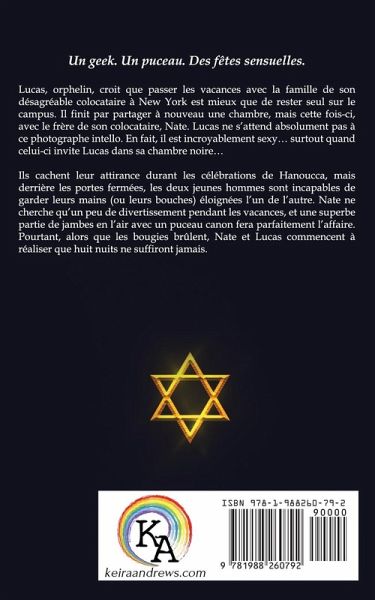 Un geek. Un puceau. Des fêtes sensuelles. Lucas, orphelin, croit que passer les vacances avec la famille de son désagréable colocataire à New York est mieux que de rester seul sur le campus. Il finit par partager à nouveau une chambre, mais cette fois-ci, avec le frère de son colocataire, Nate. Lucas ne s'attend absolument pas à ce photographe intello. En fait, il est incroyablement sexy... surtout quand celui-ci invite Lucas dans sa chambre noire... Ils cachent leur attirance durant les célébrations de Hanoucca, mais derrière les portes fermées, les deux jeunes hommes sont incapables de garder leurs mains (ou leurs bouches) éloignées l'un de l'autre. Nate ne cherche qu'un peu de divertissement pendant les vacances, et une superbe partie de jambes en l'air avec un puceau canon fera parfaitement l'affaire. Pourtant, alors que les bougies brûlent, Nate et Lucas commencent à réaliser que huit nuits ne suffiront jamais.