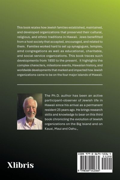 This book relates how Jewish families established, maintained, and developed organizations that preserved their cultural, religious, and ethnic traditions in Hawaii. Jews benefitted from a host society that accepted, encouraged, and related to them. Families worked hard to set up synagogues, temples, amd congregations as well as educational, charitable, and social service organizations. This book traces such developments from 1850 to the present. It highlights the complex characters, milestone events, Hawaiian history, and worldwide developments that marked and impacted how Jewish organizations came to be on the four major islands of Hawaii.
