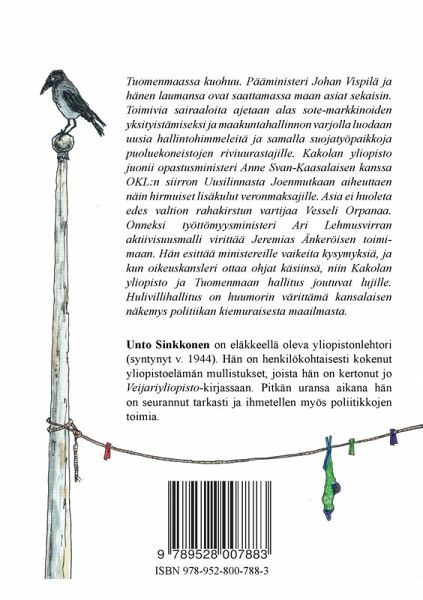 Tuomenmaassa kuohuu. Pääministeri Johan Vispilä ja hänen laumansa ovat saattamassa maan asiat sekaisin. Toimivia sairaaloita ajetaan alas sote-markkinoiden yksityistämiseksi ja maakuntahallinnon varjolla luodaan uusia hallintohimmeleitä ja samalla suojatyöpaikkoja puoluekoneistojen riviuurastajille. Kakolan yliopisto juonii opastusministeri Anne Svan-Kaasalaisen kanssa OKL:n siirron Uusilinnasta Joenmutkaan aiheuttaen näin hirmuiset lisäkulut veronmaksajille. Asia ei huoleta edes valtion rahakirstun vartijaa Vesseli Orpanaa. Onneksi työttömyysministeri Ari Lehmusvirran aktiivisuusmalli virittää Jeremias Änkeröisen toimimaan. Hän esittää ministereille vaikeita kysymyksiä, ja kun oikeuskansleri ottaa ohjat käsiinsä, niin Kakolan yliopisto ja Tuomenmaan hallitus joutuvat lujille. Hulivillihallitus on huumorin värittämä kansalaisen näkemys politiikan kiemuraisesta maailmasta. Kirjan on kuvittanut Hannu Härkönen.