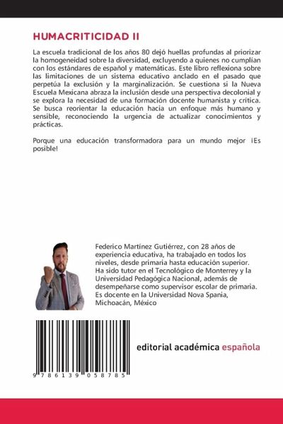 La escuela tradicional de los años 80 dejó huellas profundas al priorizar la homogeneidad sobre la diversidad, excluyendo a quienes no cumplían con los estándares de español y matemáticas. Este libro reflexiona sobre las limitaciones de un sistema educativo anclado en el pasado que perpetúa la exclusión y la marginalización. Se cuestiona si la Nueva Escuela Mexicana abraza la inclusión desde una perspectiva decolonial y se explora la necesidad de una formación docente humanista y crítica. Se busca reorientar la educación hacia un enfoque más humano y sensible, reconociendo la urgencia de actualizar conocimientos y prácticas. Porque una educación transformadora para un mundo mejor ¡Es posible!