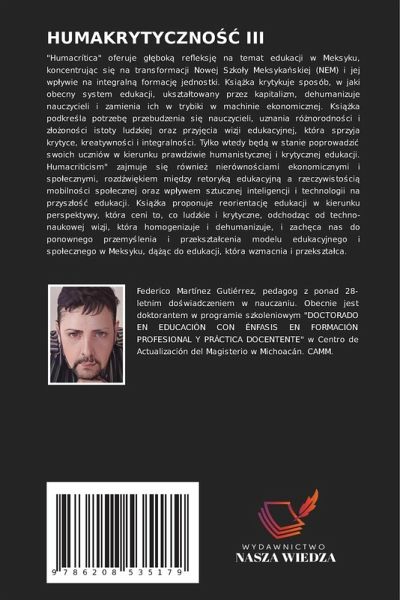 "Humacrítica" oferuje g¿¿bok¿ refleksj¿ na temat edukacji w Meksyku, koncentruj¿c si¿ na transformacji Nowej Szko¿y Meksykäskiej (NEM) i jej wp¿ywie na integraln¿ formacj¿ jednostki. Ksi¿¿ka krytykuje sposób, w jaki obecny system edukacji, uksztätowany przez kapitalizm, dehumanizuje nauczycieli i zamienia ich w trybiki w machinie ekonomicznej. Ksi¿¿ka podkre¿la potrzeb¿ przebudzenia si¿ nauczycieli, uznania ró¿norodno¿ci i z¿o¿ono¿ci istoty ludzkiej oraz przyj¿cia wizji edukacyjnej, która sprzyja krytyce, kreatywno¿ci i integralno¿ci. Tylko wtedy b¿d¿ w stanie poprowadzi¿ swoich uczniów w kierunku prawdziwie humanistycznej i krytycznej edukacji. Humacriticism" zajmuje si¿ równie¿ nierówno¿ciami ekonomicznymi i spo¿ecznymi, rozd¿wi¿kiem mi¿dzy retoryk¿ edukacyjn¿ a rzeczywisto¿ci¿ mobilno¿ci spo¿ecznej oraz wp¿ywem sztucznej inteligencji i technologii na przysz¿o¿¿ edukacji. Ksi¿¿ka proponuje reorientacj¿ edukacji w kierunku perspektywy, która ceni to, co ludzkie i krytyczne, odchodz¿c od techno-naukowej wizji, która homogenizuje i dehumanizuje, i zach¿ca nas do ponownego przemy¿lenia i przeksztäcenia modelu edukacyjnego i spo¿ecznego w Meksyku, d¿¿¿c do edukacji, która wzmacnia i przeksztäca.