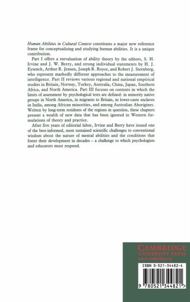 Human Abilities in Cultural Context constitutes a major new reference frame for conceptualizing and studying human abilities. It is a unique contribution. Part I offers a reevaluation of ability theory by the editors, S. H. Irvine and J. W. Berry, and strong individual statements by H. J. Eysenck, Arthur R. Jensen, Joseph R. Royce, and Robert J. Sternberg, who represent markedly different approaches to the measurement of intelligence. Part II reviews various regional and national empirical studies in Britain, Norway, Turkey, Australia, China, Japan, SOuthern Africa, and North America. Part III focuses on contexts in which the limits of assessment by psychological tests are defined: in minority native groups in North America, in migrants to Britain, in lower-caste enclaves in India, among African minorities, and among Australian Aborigines. Written by long-term residents of the regions in question, these chapters present a wealth of new data that has been ignored in Western formulations of theory and practice. After five years of editorial labor, Irvine and Berry have issued one of the best-informed, most sustained scientific challenges to conventional wisdom about the nature of mental abilities and the conditions that foster their development in decades - a challenge to which psychologists and educators must respond.