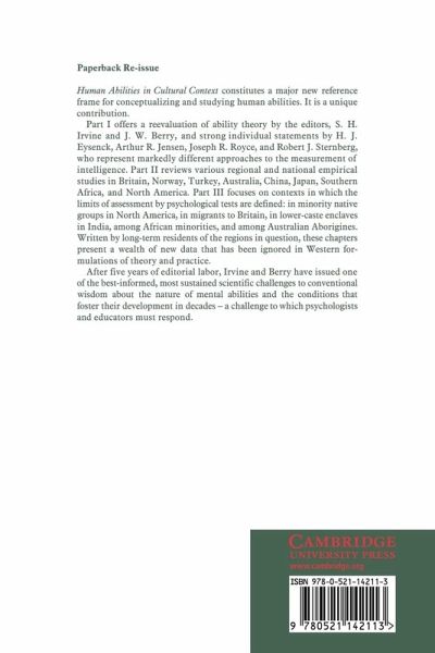 Originally published in 1988, Human Abilities in Cultural Context constituted a major development in conceptualising and studying human abilities. It formed a unique reference frame. This study offers a re-evaluation of ability theory by the editors, S. H. Irvine and J. W. Berry, and strong individual statements by H. J. Eysenck, Arthur R. Jensen, Joseph R. Royce, and Robert J. Sternberg, who represent markedly different approaches to the measurement of intelligence. It also focuses on contexts in which the limits of assessment by psychological tests are defined: in minority native groups in North America, in migrants to Britain, in lower-caste enclaves in India, among African minorities, and among Australian Aborigines. Written by long-term residents of the regions in question, these chapters presented a wealth of fresh data in relation to Western formulations of theory and practice.