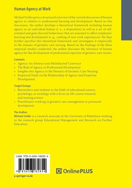 Michael Goller gives a structured overview of the current discourses of human agency in relation to professional learning and development. Based on this discussion, the author develops a theoretical framework including human agency as an individual feature (i. e., a disposition) as well as a set of self-initiated and goal-directed behaviours that are assumed to affect employees' learning and development (e. g., crafting of new work experiences). He then further specifies this theoretical framework and investigates it empirically in the domain of geriatric care nursing. Based on the findings of the three empirical studies conducted, the author discusses the relevance of human agency for the development of professional expertise of geriatric care nurses.