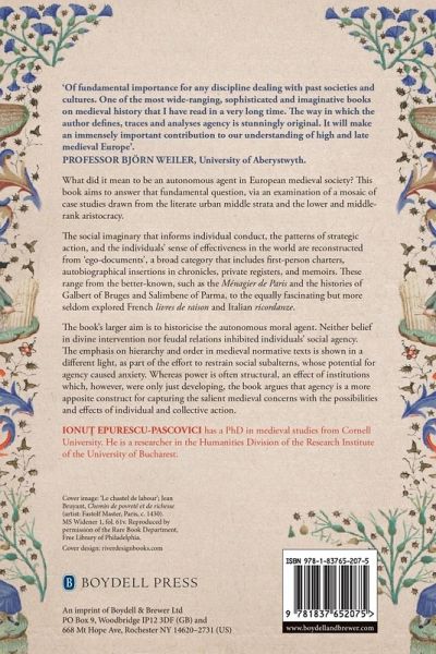Argues the case for the individual as autonomous moral agent in the later Middle Ages. "Of fundamental importance for any discipline dealing with past societies and cultures. One of the most wide-ranging, sophisticated and imaginative books on medieval history that I have read in a very long time. The way in which the author defines, traces and analyses agency is stunningly original. It will make an immensely important contribution to our understanding of high and late medieval Europe." Professor Björn Weiler, University of Aberystwyth What did it mean to be an autonomous agent in European medieval society? This book aims to answer that fundamental question, via an examination of a mosaic of case studies drawn from the literate urban middle strata and the lower and middle-rank aristocracy. The social imaginary that informs individual conduct, the patterns of strategic action, and the individuals' sense of effectiveness in the world are reconstructed from "ego-documents", a broad category that includes first-person charters, autobiographical insertions in chronicles, private registers, and memoirs. These range from the better-known, such as the Ménagier de Paris and the histories of Galbert of Bruges and Salimbene of Parma, to the equally fascinating but more seldom explored French livres de raison and Italian ricordanze. The book's larger aim is to historicise the autonomous moral agent. Neither belief in divine intervention nor feudal relations inhibited individuals' social agency. The emphasis on hierarchy and order in medieval normative texts is shown in a different light, as part of the effort to restrain social subalterns, whose potential for agency caused anxiety. Whereas power is often structural, an effect of institutions which, however, were only just developing, the book argues that agency is a more apposite construct for capturing the salient medieval concerns with the possibilities and effects of individual and collective action.