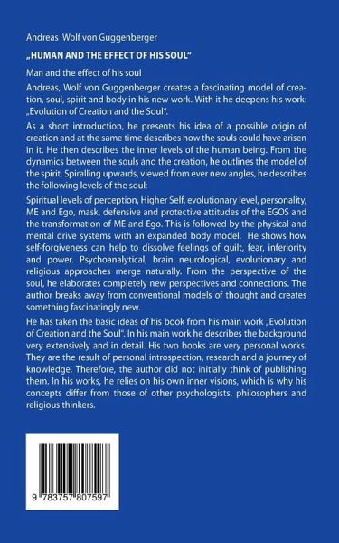 "HUMAN AND THE EFFECT OF HIS SOUL"Man and the effect of his soul Andreas, Wolf von Guggenberger creates a fascinating model of crea-tion, soul, spirit and body in his new work. With it he deepens his work: "Evolution of Creation and the Soul".As a short introduction, he presents his idea of a possible origin of creation and at the same time describes how the souls could have arisen in it. He then describes the inner levels of the human being. From the dynamics between the souls and the creation, he outlines the model of the spirit. Spiralling upwards, viewed from ever new angles, he describes the following levels of the soul: Spiritual levels of perception, Higher Self, evolutionary level, personality, ME and Ego, mask, defensive and protective attitudes of the EGOS and the transformation of ME and Ego. This is followed by the physical and mental drive systems with an expanded body model. He shows how self-forgiveness can help to dissolve feelings of guilt, fear, inferiority and power. Psychoanalytical, brain neurological, evolutionary and religious approaches merge naturally. From the perspective of the soul, he elaborates completely new perspectives and connections. The author breaks away from conventional models of thought and creates something fascinatingly new.He has taken the basic ideas of his book from his main work "Evolution of Creation and the Soul". In his main work he describes the background very extensively and in detail. His two books are very personal works. They are the result of personal introspection, research and a journey of knowledge. Therefore, the author did not initially think of publishing them. In his works, he relies on his own inner visions, which is why his concepts differ from those of other psychologists, philosophers and religious thinkers.