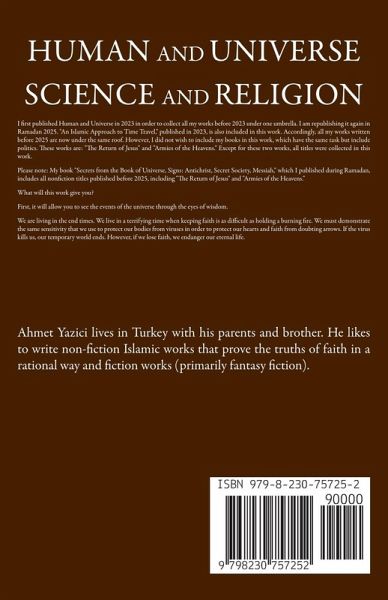 I first published Human and Universe in 2023 in order to collect all my works before 2023 under one umbrella. I am republishing it again in Ramadan 2025. "An Islamic Approach to Time Travel," published in 2023, is also included in this work. Accordingly, all my works written before 2025 are now under the same roof. However, I did not wish to include my books in this work, which have the same task but include politics. These works are "The Return of Jesus" and "Armies of the Heavens." Except for these two works, all titles were collected in this work. Note: My work "Secrets from the Book of Universe, Signs: Antichrist, Secret Society, Messiah" includes all nonfiction titles published before 2025 without exception. Please pay attention. What will this work give you? First, it will allow you to see the events of the universe through the eyes of wisdom. We are living in the end times. We live in a terrifying time when keeping faith is as difficult as holding a burning fire. We must demonstrate the same sensitivity that we use to protect our bodies from viruses in order to protect our hearts and faith from doubting arrows. If the virus kills us, our temporary world ends. However, if we lose faith, we endanger our eternal life. The most important topics of the book "Human and Universe, Science and Religion" can be listed as follows: A Glimpse to the Unseen Realms: Prophecy: How Can Soothsayers Predict the Future? Since no one but Allah knows the future, how come the prophecies of some soothsayers always come true? How come the news of soothsayers like Nostradamus about the future always comes true? Who was the person who foretold the Ottoman State before its establishment? What's the secret of shooting stars? You will find the answers to the questions that confuse you in this section... Understanding the Presence of the Spirit: This work will help the minds to get rid of delusions and doubts about the soul... Unmaterial Molds: Even a simple house cannot exist by itself. So where is the engineer and architect of this enormous universe palace full of antique arts? What mold do these wonderful animate and inanimate objects come out of? How astonishing are the countless events that we witness at every moment? So why aren't we amazed? Could it be because we got used to it and it became commonplace to us? Big Crunch: Invisible Apocalyptic Machines The Hour is near. The countdown to the apocalypse has begun. It's like a ticking time bomb with ten seconds to go off. That's why we experience the truth that time speeds up when the apocalypse approaches. From time to time, different fields of the scientific world make statements such as, "A thousand years later, our earth will be in this situation; 10 million years later, the sun will be like this; this country will be in this situation, etc." What if I told you that the world doesn't have a life span of 200 years? We are about to count down to the apocalypse according to universe time. The Prophet (PBUH) said: "The lifespan of my Ummah will not extend past 1500 years." I'm sure the scientific truths revealed by the Qur'an and the prophet (PBUH) fourteen centuries ago astounded you. Your astonishment will grow even stronger as you read this book. -Quantum to Ether In this section, I mentioned the relationship between theories such as string and quantum with the name Al-Qayyum. I also discussed the mystery of the ether substance. -An Islamic Approach to Time Travel -Can God Create a Rock He Cannot Lift?: Omnipotence Paradox -Genetic Copy ... Note: All titles in this book will continue to be available individually.