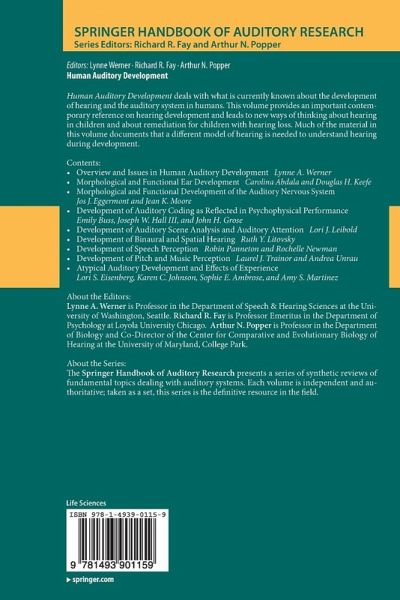 Introduction and overview.- Morphological and functional development of the ear .- Morphological and functional development of the auditory nervous system.- Development of auditory coding as reflected in psychophysical performance .- Development of auditory scene analysis and auditory attention.- Development of spatial hearing.- Development of speech perception.- Development of pitch and music perception.- Atypical auditory development and effects of experience.- Summary, interrelationships, implications, future directions.- Index.