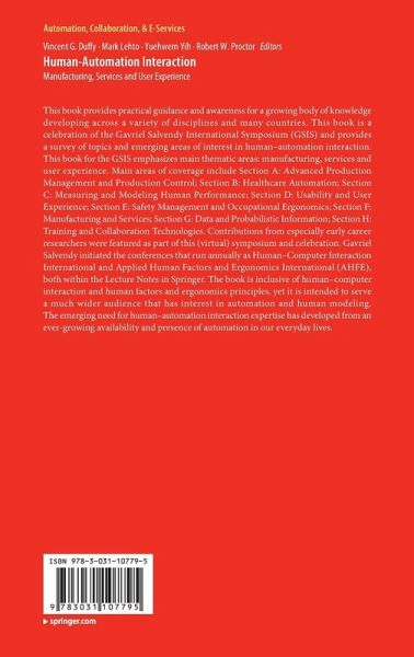 This book provides practical guidance and awareness for a growing body of knowledge developing across a variety of disciplines and many countries. This book is a celebration of the Gavriel Salvendy International Symposium (GSIS) and provides a survey of topics and emerging areas of interest in human-automation interaction. This book for the GSIS emphasizes main thematic areas: manufacturing, services and user experience. Main areas of coverage include Section A: Advanced Production Management and Production Control; Section B: Healthcare Automation; Section C: Measuring and Modeling Human Performance; Section D: Usability and User Experience; Section E: Safety Management and Occupational Ergonomics; Section F: Manufacturing and Services; Section G: Data and Probabilistic Information; Section H: Training and Collaboration Technologies. Contributions from especially early career researchers were featured as part of this (virtual) symposium and celebration. Gavriel Salvendyinitiated the conferences that run annually as Human-Computer Interaction International and Applied Human Factors and Ergonomics International (AHFE), both within the Lecture Notes in Springer. The book is inclusive of human-computer interaction and human factors and ergonomics principles, yet it is intended to serve a much wider audience that has interest in automation and human modeling. The emerging need for human-automation interaction expertise has developed from an ever-growing availability and presence of automation in our everyday lives.