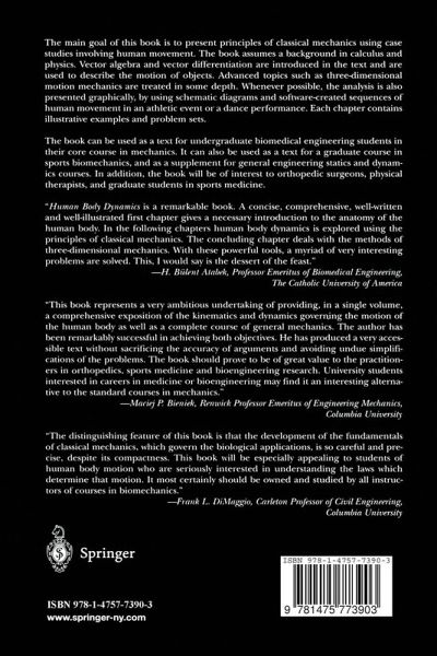 From the reviews: "This book represents a very ambitious undertaking of providing, in a single volume, a comprehensive exposition of the kinematics and dynamics governing the motion of the human body as well as a complete course of general mechanics. The author has been remarkably successful in achieving both objectives. He has produced a very accessible text without sacrificing the accuracy of arguments and avoiding undue simplifications of the problems. The book should prove to be a great value to the practitioners in orthopedics, sports medicine and bioengineering research. University students interested in careers in medicine or bioengineering may find it an interesting alternative to the standard courses in mechanics." Maciej P. Bieniek, Renwick Professor Emeritus of Engineering Mechanics, Columbia University "Human Body Dynamics is a remarkable book. A concise, comprehensive, well-written and well-illustrated first chapter gives a necessary introduction to the anatomy of the human body. In the following chapters human body dynamics is explored using the principles of classical mechanics. The concluding chapter deals with the methods of three-dimensional mechanics. With these powerful tools, a myriad of very interesting problems are solved. This, I would say is the dessert of the feast." H. Buelent Atabek, Professor Emeritus of Biomedical Engineering, Catholic University of America