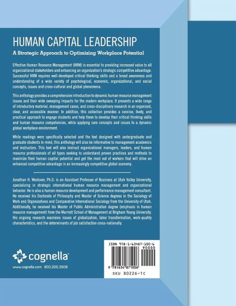 "Human Capital Leadership: A Strategic Approach to Optimizing Workplace Potential provides a comprehensive introduction to human resource management issues in the modern workplace. Focused on understanding complex human behavior within a dynamic organizational context, the book covers strategic human capital leadership, globalization, and strategic IHRM to meet AACSB requirements. Human Capital Leadership presents a wide range of introductory material, human resource management readings, management case studies, and cross-disciplinary research in an organized, clear, and accessible manner. The concise and lively approach of the text engages students and helps them develop their critical thinking skills and human resource competencies, while applying core concepts to a global workplace environment. Of special note are the supplemental resources, most of which are not typically available in academic readers. These include in-depth glossaries, a topical index, and appendices on U.S. employment and labor law. Written for undergraduate and graduate business students, the substantive content of Human Capital Leadership makes the book a successful stand-alone text for courses in human resource management. It can also be used as a supplemental reader to standard textbooks. In addition, it is a useful resource for organizational managers, leaders, and human resource professionals seeking to understand proven practices and methods in order to maximize their human capital potential. Jonathan H. Westover is an associate professor of management and associate director of the Center for the Study of Ethics at Utah Valley University, specializing in international human resource management, organizational development, and community-engaged experiential learning. He is also an organizational development and performance management consultant. Professor Westover is a Fulbright Scholar and is a regularly visiting faculty member in other graduate business programs in the U.S., U.K., France, Belarus, Poland, and China. His ongoing research examines issues of globalization, labor transformations, work quality characteristics, and the determinants of job satisfaction cross-nationally.