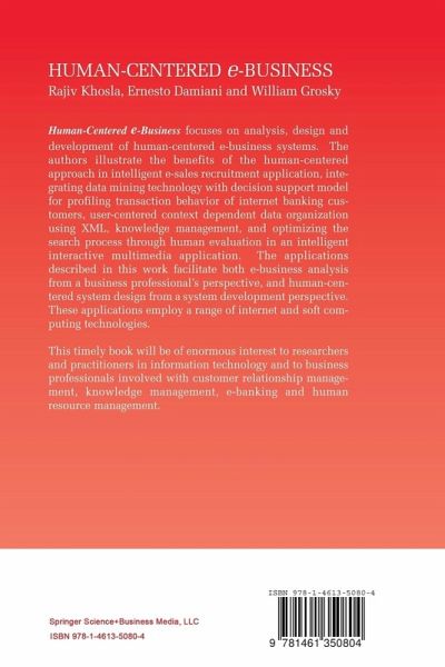 Human-Centered e-Business focuses on analysis, design and development of human-centered e-business systems. The authors illustrate the benefits of the human-centered approach in intelligent e-sales recruitment application, integrating data mining technology with decision support model for profiling transaction behavior of internet banking customers, user-centered context dependent data organization using XML, knowledge management, and optimizing the search process through human evaluation in an intelligent interactive multimedia application. The applications described in this work, facilitates both e-business analysis from a business professional's perspective, and human-centered system design from a system development perspective. These applications employ a range of internet and soft computing technologies.